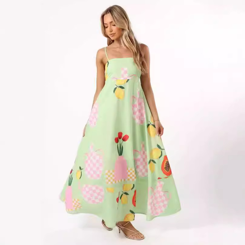Summer Striped Printed Suspender Long Dress With Pockets Fashion Square Neck Backless Dresses For Beach Vacation Women Clothing